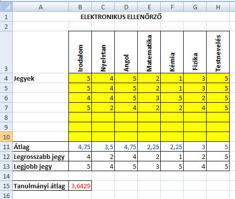 A táblázat fejlécében (a tantárgyak beírásakor) a Cellaformázás menüpont Igazítás lapján a szöveg elforgatásával állítottuk be a függőleges írásirányt. Figyeljünk arra, hogy egy cellába csak egyetlen adat kerülhet! Ha az átlag kiszámításakor az argomentumokba bejelöljük a még ki nem töltött sárgára festett terület celláit is, akkor az új számok beírásakor a z Excel figyelembe fogja venni az újonnan beírt adatokat is (dinamikus táblázat). A Tanulmányi átlag kiszámításakor az Átlag sor átlagát kell képezni.