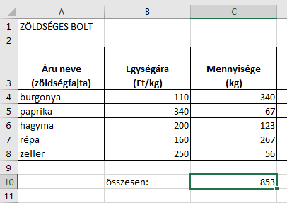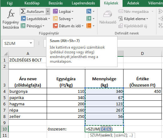 Írjuk be a B10-es cellába: összesen, majd kattintsunk a C10-es cellára. Ezután kattintsunk az AutoSzum függvényre! A program érzékeli, hogy itt csak a C4:C9 tartomány számairól lehet szó, mert a sor nem tartalmaz számokat, csak az oszlop. A számokat tartalmazó tartomány bekereteződik, és a C10-es cellában a SZUM függvény neve mellé íródik. Ezt a zárójelben levő tartományt, a függvény argomentumának nevezik, ez határozza meg a számításhoz használt adatok helyét.