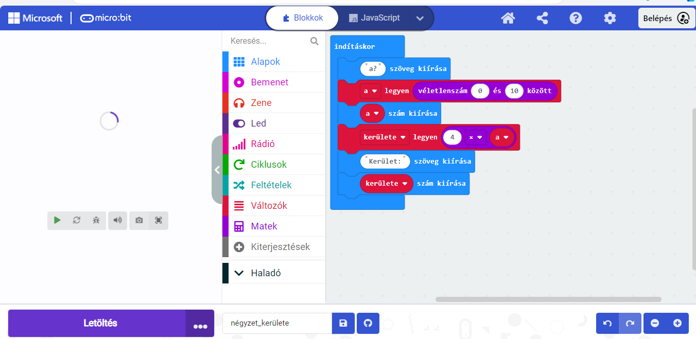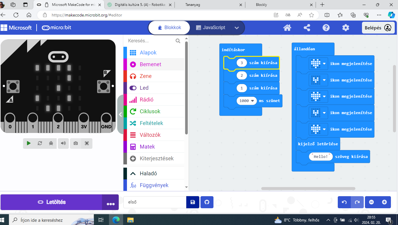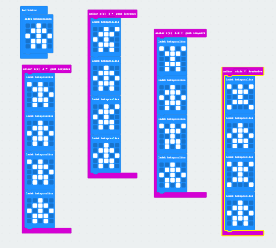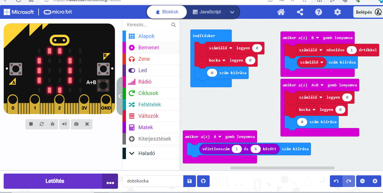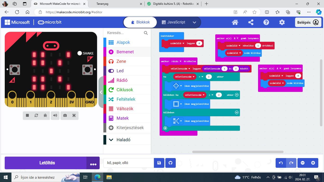 Microbit: első, második, dobókocka, négyzet kerülete, kő-papír-olló, hullócsillag